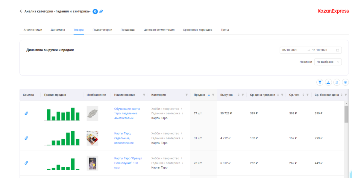 Около 80 раз приобрели за неделю колоду обучающих аметистовых карт Таро на KazanExpress. В категории «Гадания и эзотерика» наиболее успешному селлеру удалось получить выручку около 30 тысяч рублей за 7 дней. Товар появился на маркетплейсе в январе 2023 года и до сих пор периодически выходит в топ.