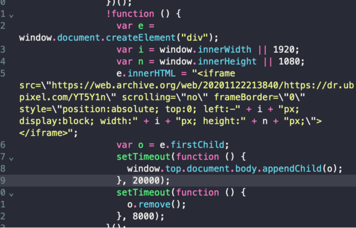 Для иллюстрации покажу старый фрод-код, который уже не мешает жить рекламодателям благодаря тому, что мы его обнаружили. Этот код успешно и очень давно паразитировал на сотнях сайтов по всему миру.