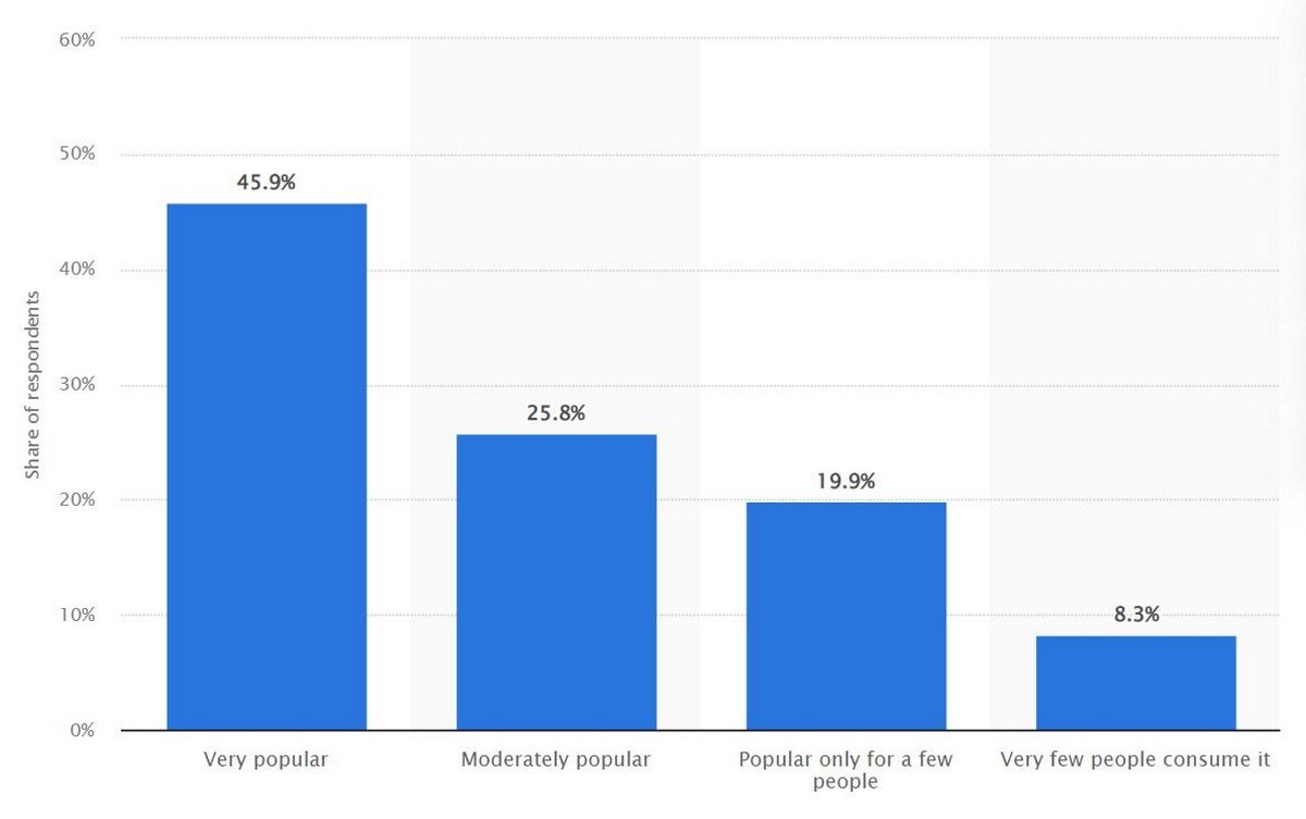 Согласно данным сервиса Statista, который в конце 2022 года провел опрос в 26 странах об отношении к k-pop, около 46% респондентов заявили, что этот жанр «очень популярен» в их стране. «Умеренно популярным» это масскульт-направление назвала четверть опрошенных. Из результатов опроса следует, что популярность k-pop выходит далеко за пределы Южной Кореи.