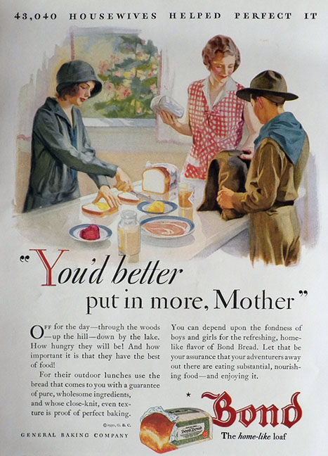 Мальчики-разведчики десятилетиями были такой типичной приметой американского образа жизни, что рекламодатели не могли обойтись без их образов. На этом рекламном объявлении бойскаут просил маму положить в его вещмешок побольше хлеба Bond.