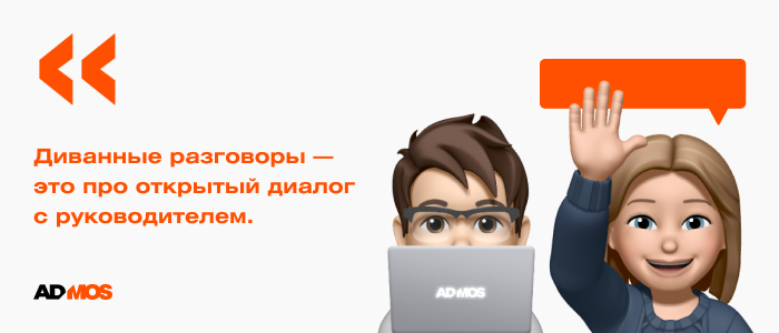 В ADMOS мы практикуем «диванные разговоры» с руководителем. Конечно, это не «просто поболтать и рассказать все новости», а открытый диалог с руководителем. Сотрудник имеет возможность всегда поделиться важным в моменте, спросить совет, попросить взгляд со стороны на сложную ситуацию.