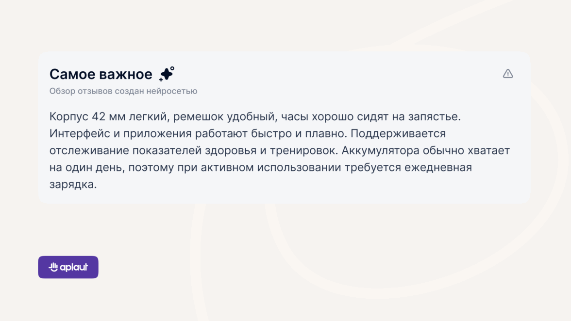 Суммаризация отзывов помогает пользователям быстрее разобраться в товаре и решить, стоит он своих денег или нет. Читатели AI-сводок реже жалеют о выбранных продуктах. Не менее полезна суммаризация и для бизнеса. Благодаря AI-обзорам клиенты Aplaut получают ещё один способ, чтобы улучшить основные бизнес-метрики.