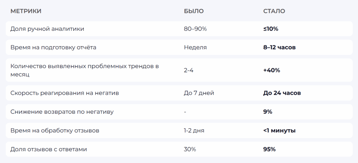 11. Снизить долю ручной аналитики по отзывам до уровня не более 10%.