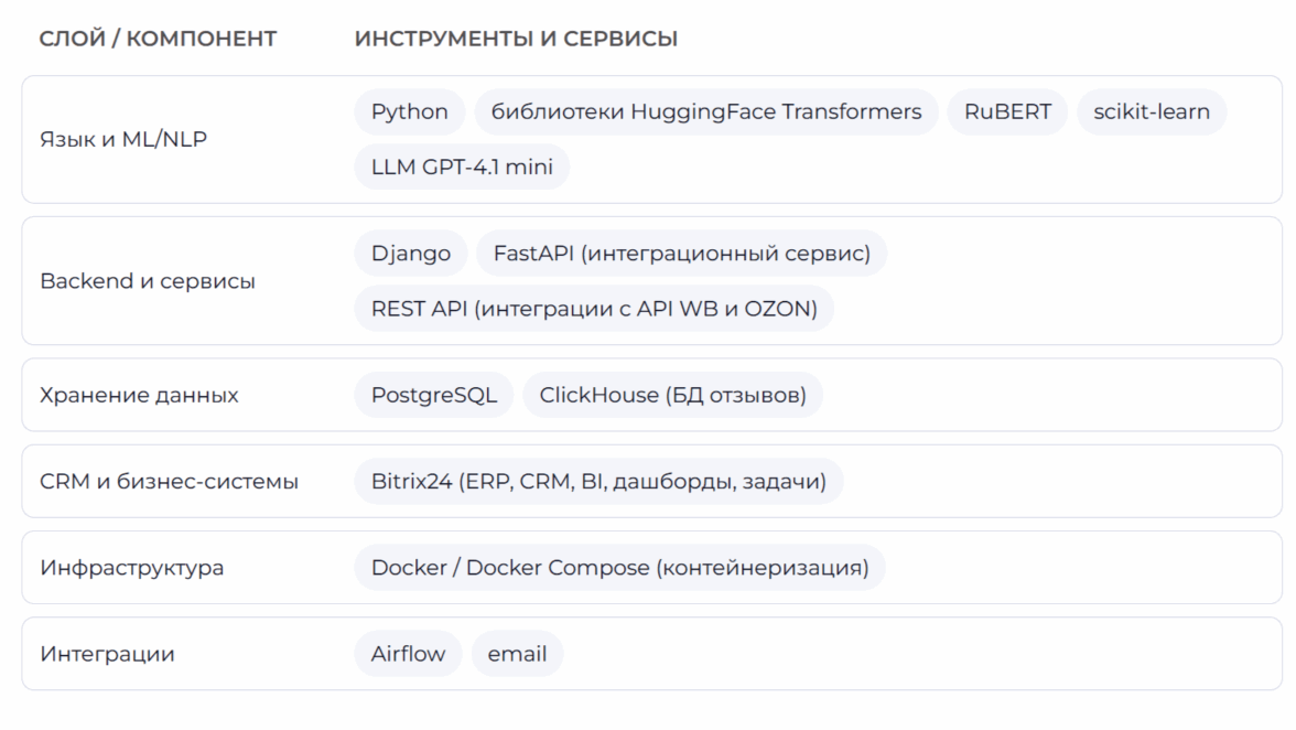 Мы выстроили единый контур работы с фидбэком. Сначала объединили отзывы из Ozon и Wildberries в общий поток и развернули поверх него LLM-ядро для разметки тональности и извлечения ключевых фактов из отзывов, которые напрямую влияли на удовлетворенность сервисом.