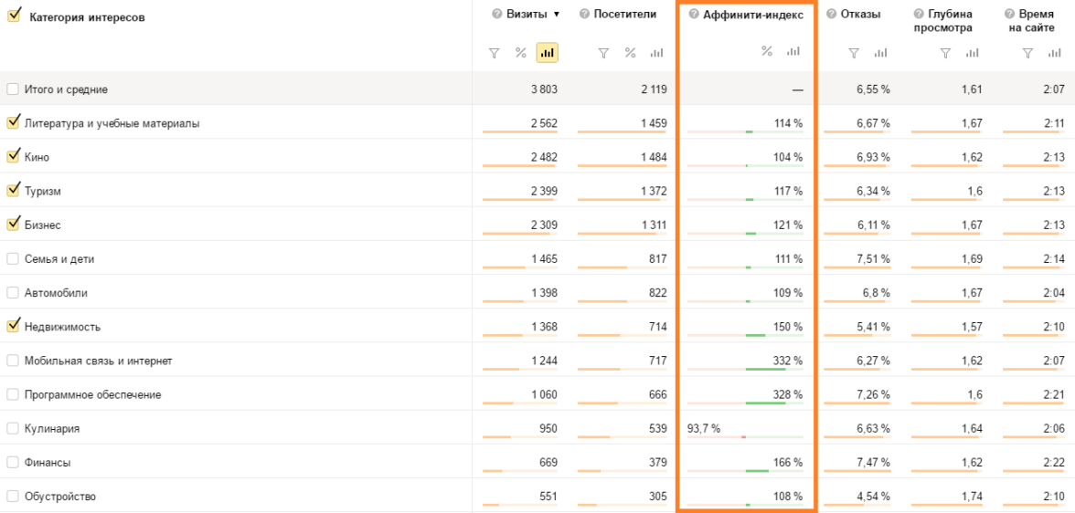 Яндекс Метрика помогает рассчитывать Affinity Index для определенных категорий интересов автоматически в разделе «долгосрочные интересы». Это дополнительная возможность изучить интересы посетителей вашего веб-сайта.