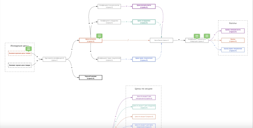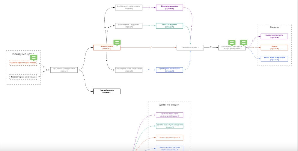 Мы предусмотрели создание и редактирование видов расчётных цен и баллов внутри компании и для клиентов. Поэтому при внесении цены товара в систему, автоматически для нее должны рассчитываться дополнительные цены с модификаторами. Модификаторы — это, например, курс валюты в выбранной стране или кластере, цена балла консультанта, фиксированные цены (если они установлены для товара) и другое. В итоге мы спроектировали всё так, что расчёт цен с модификаторами будет происходить очень быстро, а также автоматически будут выводиться итоговые значения в рамках конкретной заявки по формированию цен.