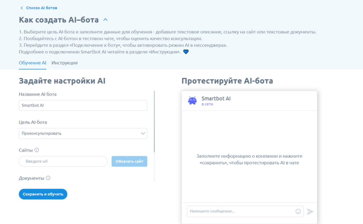 В Smartbot есть режим AI, который позволяет обучить бота по вашей базе знаний — скрипты продажников, ответы на частые вопросы клиентов, вся информация о компании и товарах. Через пять минут чат-бот будет знать все о вашем бизнесе, поэтому сможет ответить на любой вопрос заказчика, как живой человек.