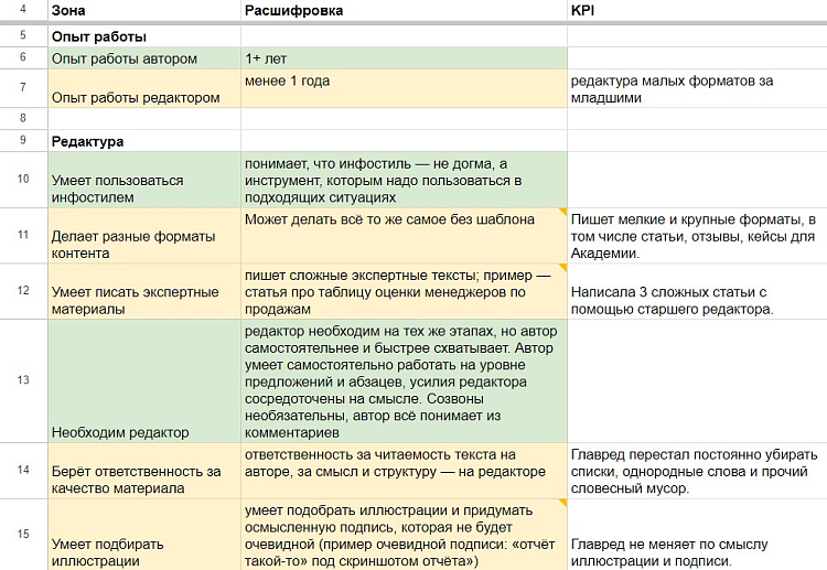 Пример плана роста для младшего редактора: зелёным отмечены навыки, которые уже прокачаны, а жёлтым, которые сотруднику предстоит освоить. К плану роста мы периодически возвращаемся, чтобы оценить, что уже сделано, а какие зоны ещё стоит подтянуть