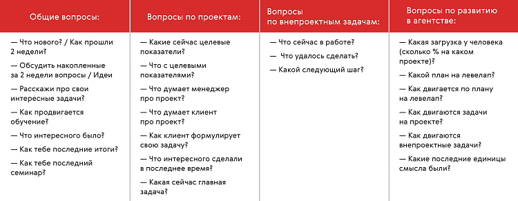 На первом этапе, когда мы готовим аналитику, считаем прогнозные воронки и запускаем проект, больше всего коммуникаций и задач, поэтому и вопросов для обсуждения на личных планёрках много. После запуска проекта, когда воронка работает и мы попали в целевые показатели, вопросов становится меньше, а остаются в основном те, что касаются именно плана роста.Также тип вопросов зависит от уровня сотрудника. У младших больше общих вопросов, например, как всё организовано в агентстве, как выставить счета, где отметить отпуск, и вопросов по закрытию базовых зон: как настраивать контекстную рекламу, готовить аналитику, работать с отчётностью. Мидлы спрашивают о продажах, подготовке коммерческого предложения, общении с клиентом, личном развитии и развитии юнита. История с вопросами часто повторяется от одного джедая к другому, и ты проходишь с каждым сотрудником плюс-минус похожий путь. В то же время небольшая разница в вопросах всё равно есть, поскольку у всех прокачаны разные зоны.