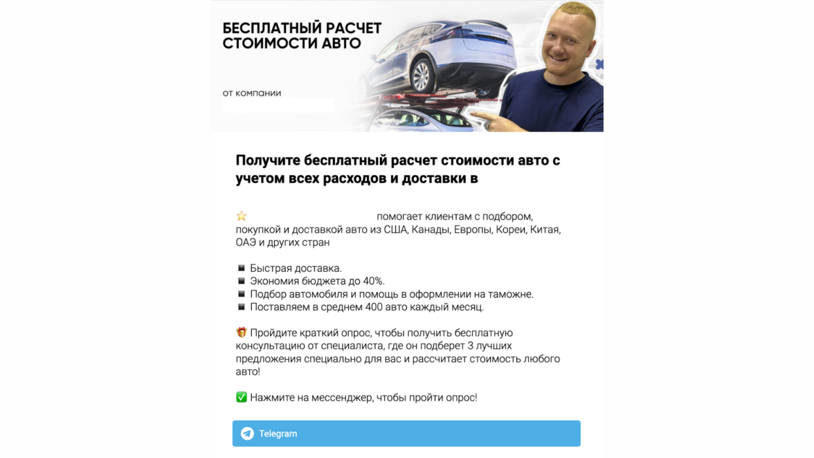 Мы разработали автоворонку, внутри которой пользователю нужно было пройти опрос и в конце оставить контактные данные, чтобы получить расчет стоимости и подбор авто от специалиста.
