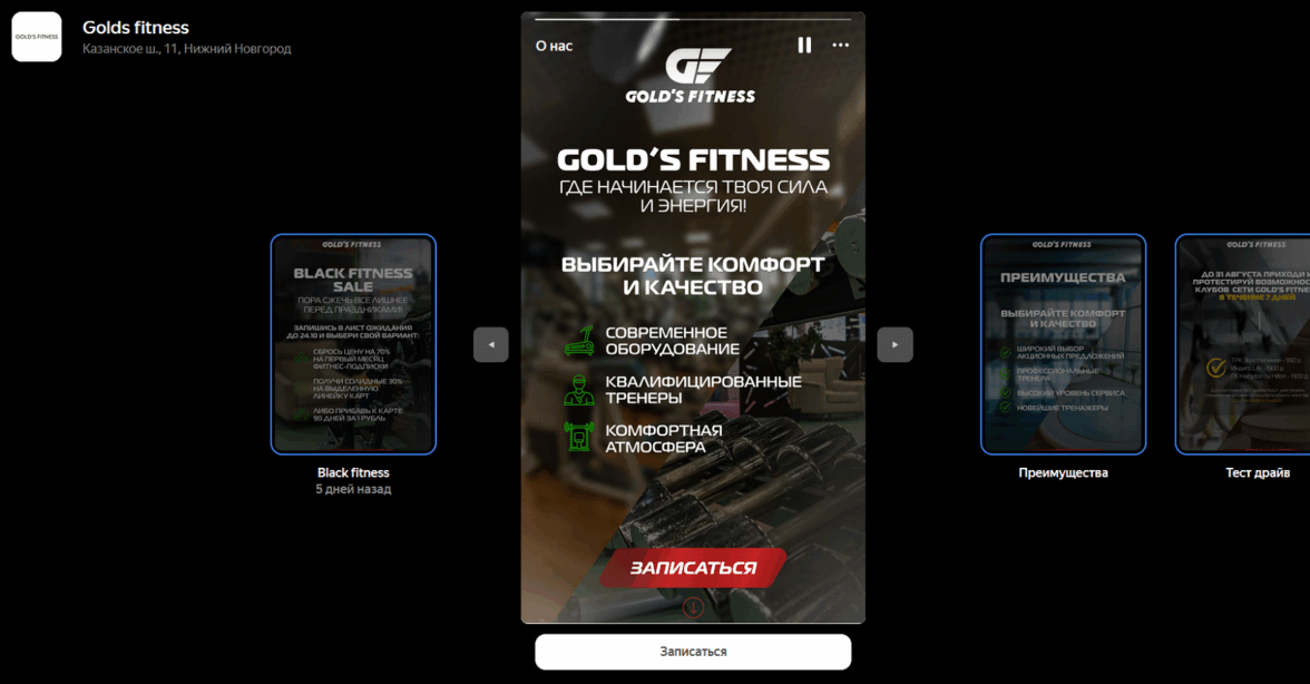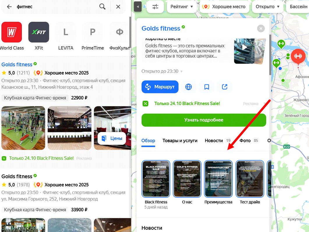 Осенью 2023 года для давнего клиента (сеть фитнес-клубов) был протестирован новый канал — сторис в «Яндекс Картах». На тот момент этот бесплатный инструмент практически не использовался в спортивной индустрии.