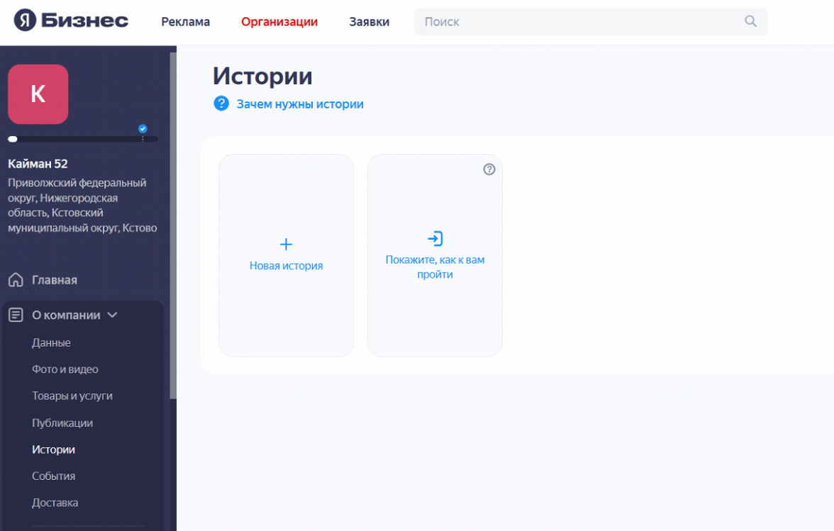 Сперва нужно войти в личный кабинет компании на «Яндекс Бизнесе». Истории находятся во вкладке «Истории» раздела меню «О компании»: