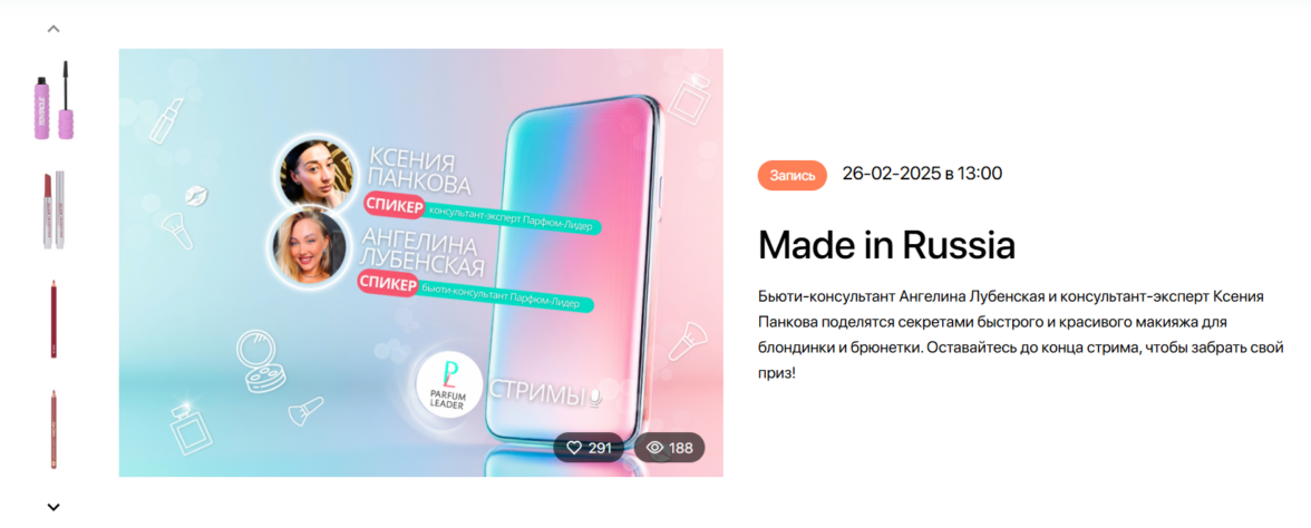 Этот формат ещё называют «live-commerce», то есть «продажи во время онлайн-трансляций». Бренды демонстрируют товар, общаются с аудиторией, отвечают на вопросы, а зрители получают персонализированный опыт и стимулы к покупке: эксклюзивные скидки, розыгрыши, бонусы. Яркий представитель формата на российском рынке — контентплейс Wibes от Wildberries, который запустили в марте 2025 года.