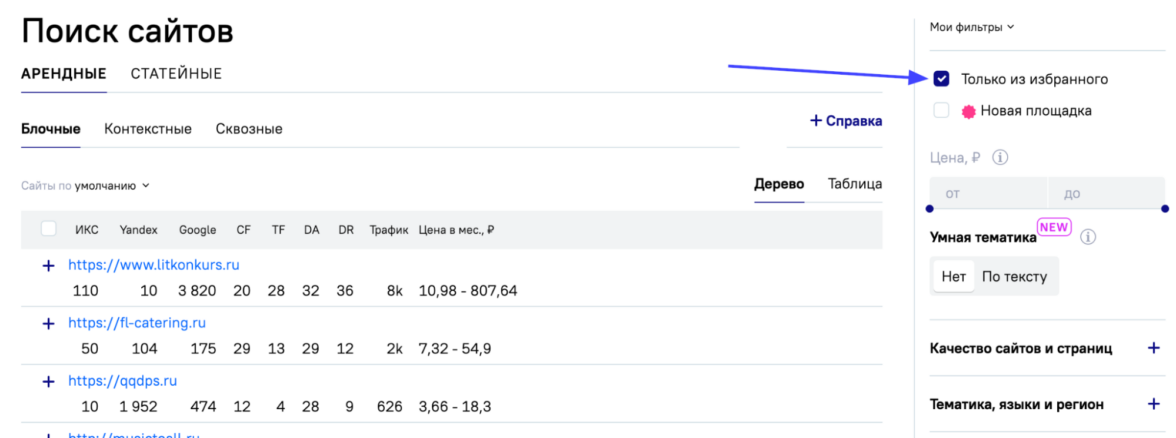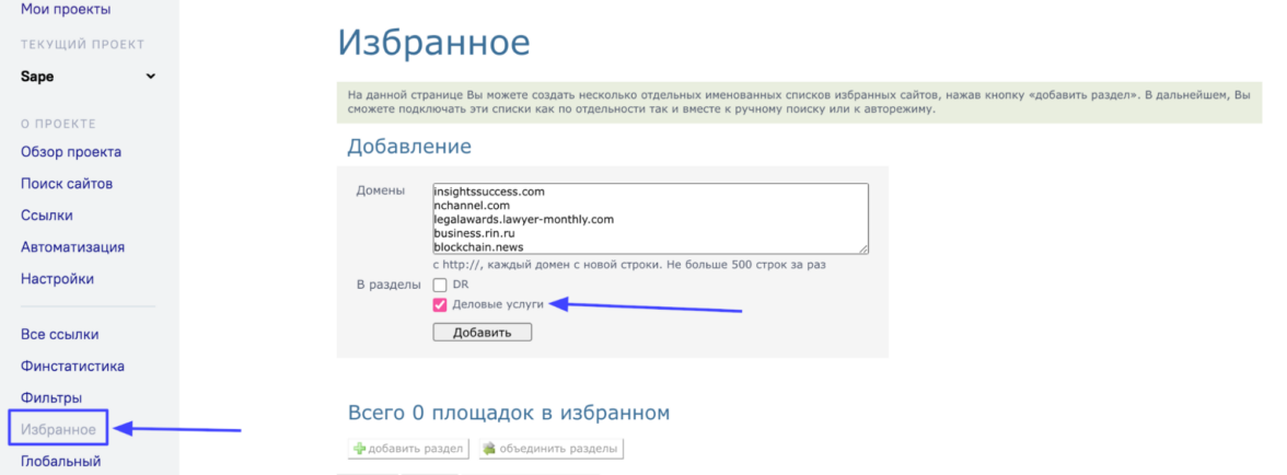 1. В разделе «Избранное» личного кабинета Links.Sape добавьте те площадки из предложенной подборки, которые наиболее релевантны для вашего сайта.
