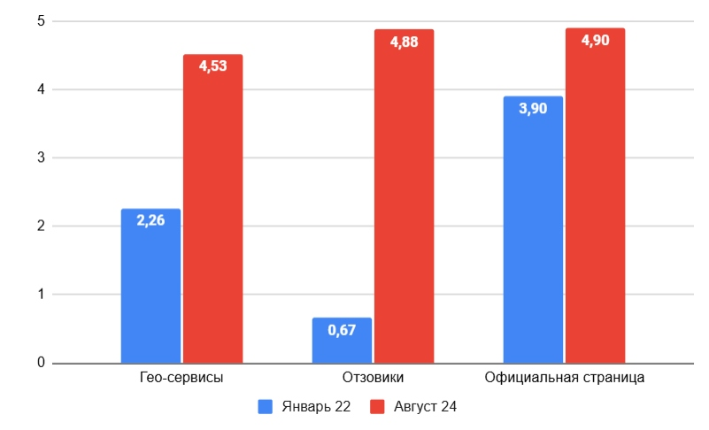 Увеличен средний рейтинг карточек компании на ГЕО-сервисах до 4,53 (+2,27), а на сайтах-отзовиках до 4,88 (+4,21).