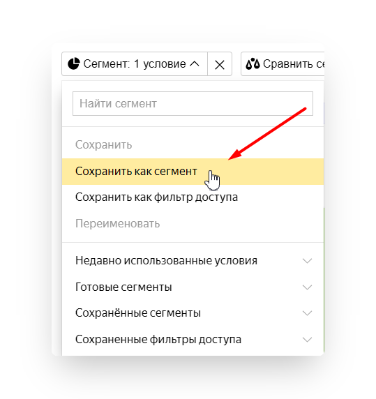 Теперь мы можем создать сегмент. Для этого над графиком нажимаем на «Сегмент: 1 условие» (количество условий зависит от заданных вами параметров) и выбираем «Сохранить как сегмент».