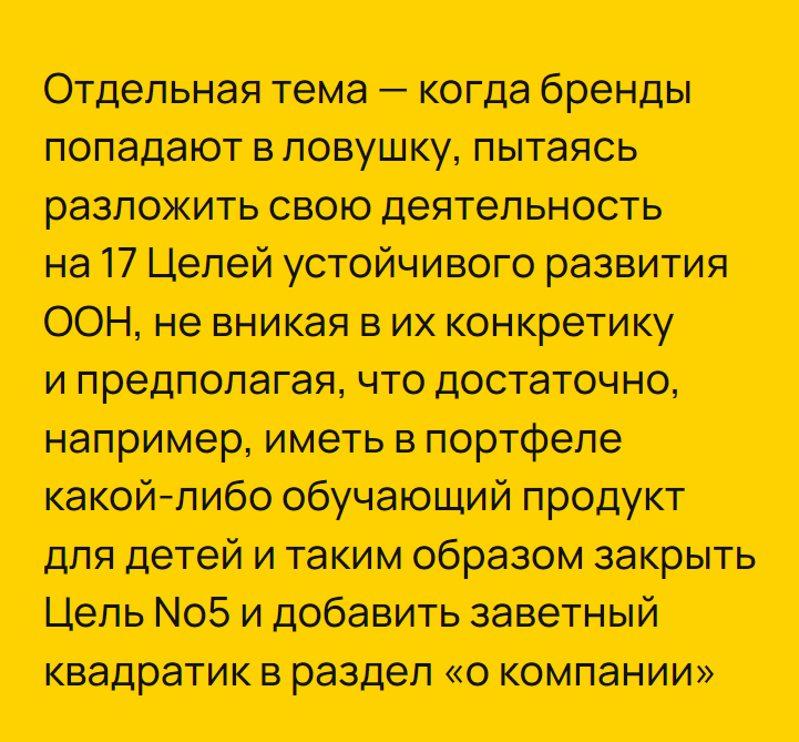 Однако зачастую такой глобальный посыл остается лишь декларацией. Бренды рассказывают о реализации целей устойчивого развития ООН, но недостаточно выпустить «био-пакеты» с лозунгом, продолжая при этом печатать чеки и не создавать реальных изменений здесь и сейчас — в обществе, экономике и экологии.