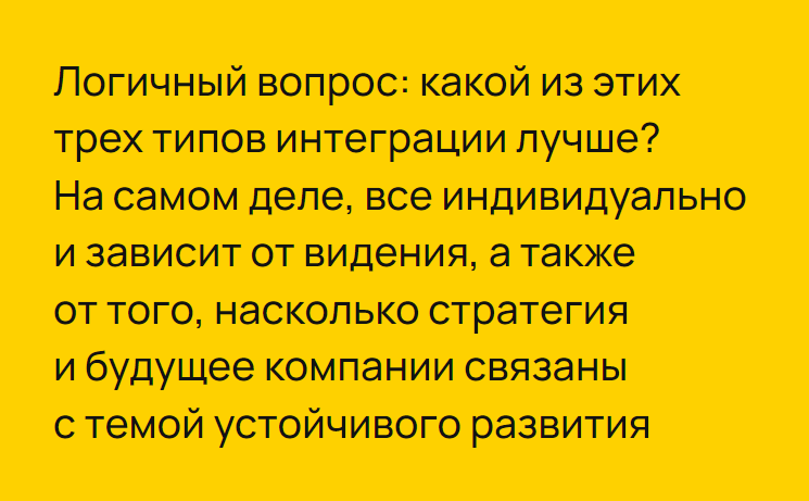 Эти два типа интеграции позволяют органично освещать повестку устойчивого развития как в корпоративных, так и в продуктовых коммуникациях.