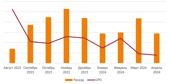Динамика расхода и стоимости заказа за период рекламной кампании, в рублей