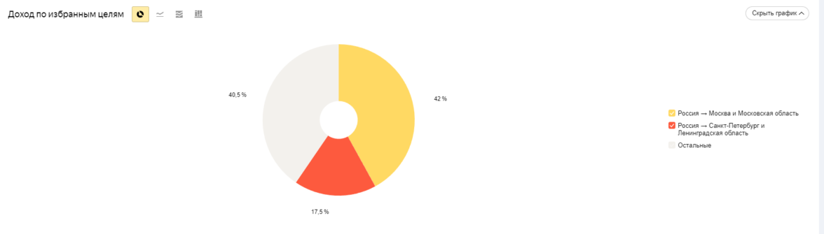 Распределение инвестиций по географии было основано на текущих данных о конверсии и доходе с каждого региона. Мы учли специфику спроса, особенности поведения потребителей и конкурентную среду в каждом из выбранных регионов.