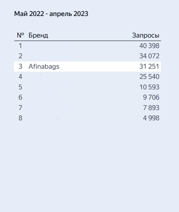 Питерский бренд женских сумок и рюкзаков Afina. Все изделия выполнены вручную из натуральной кожи. На рынке с 1996 года. С клиентом сотрудничаем более 2-х лет по продвижению официального интернет-магазина через контекстную рекламу.