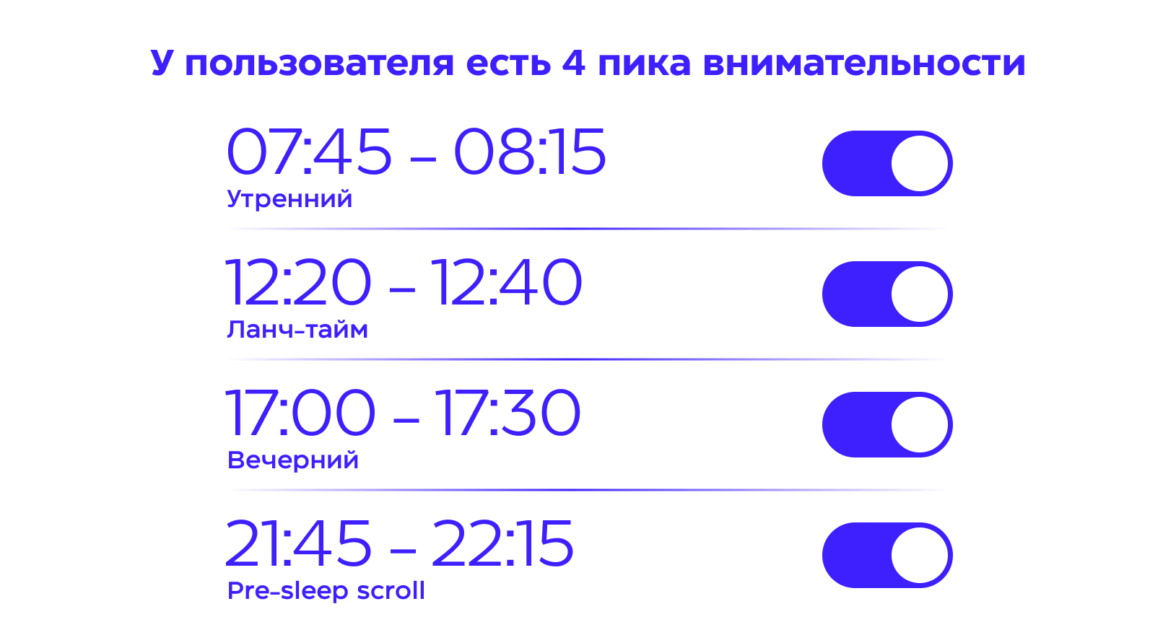 целевой хронотип аудитории — графики сна и отдыха, тайминги медиапотребления. Например, если ваши пользователи — белые воротнички, то скорее всего они активно потребляют контент утром во время завтрака. Если геймеры — то, наоборот, поздним вечером и даже ночью.