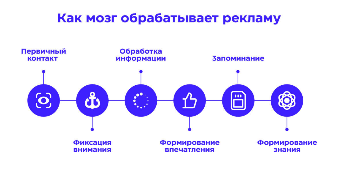 Всё начинается с внимания. Если рекламу не заметят, она не сможет повлиять на формирование знания. Объясним подробнее процессы, которые происходят в сознании аудитории после первого контакта с медийной рекламой.