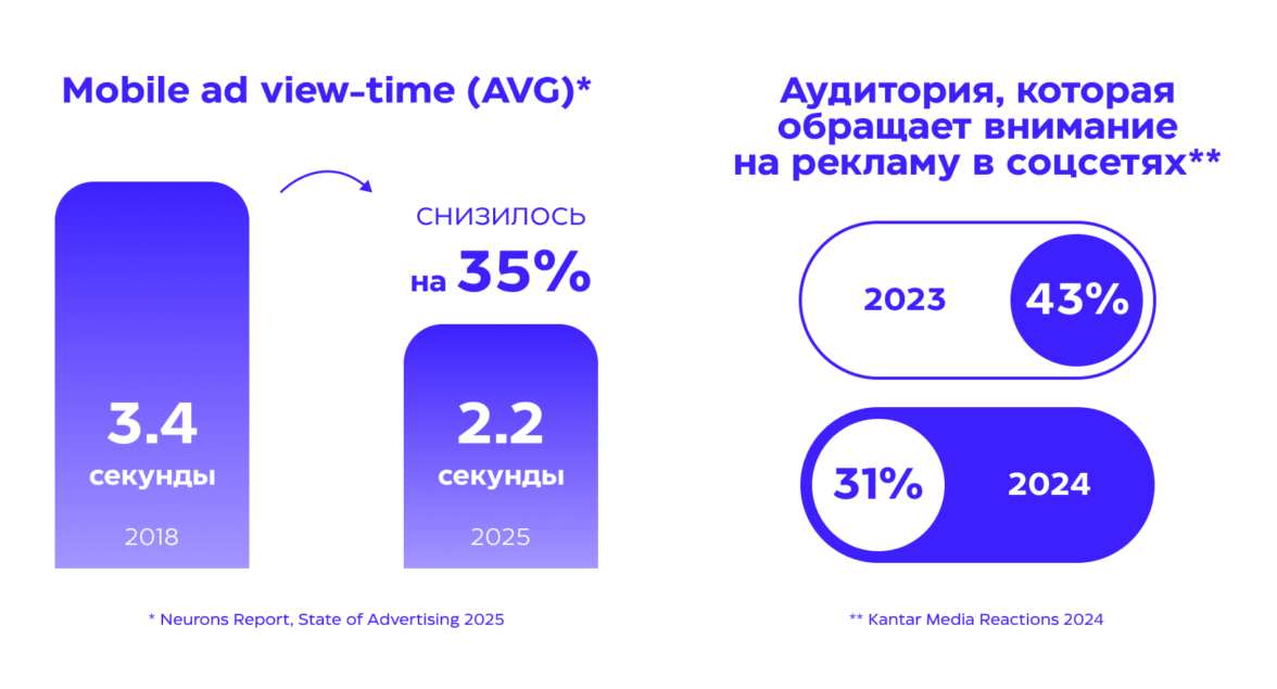 Пользователи игнорируют 86% рекламы на десктопе, а если и останавливают свой взгляд на баннере, то всего лишь на 0,2 сек (EyeQuant, 2022). Брендам приходится бороться буквально за каждую секунду внимания.