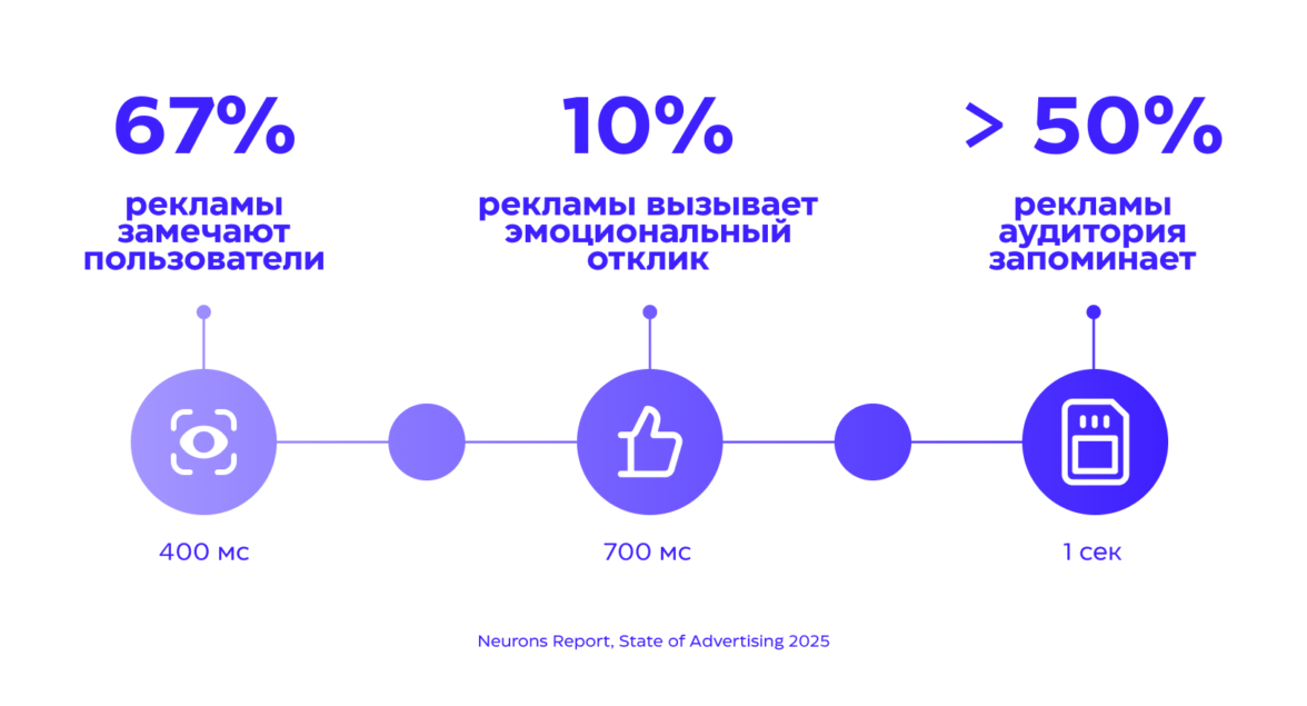 А чтобы запомниться, вам понадобится 3 сек — именно столько времени нужно человеку, чтобы считать одно сообщение. Правда 75% рекламных креативов в диджитале не достигают цели за это время, то есть весомая часть бюджетов расходуется неэффективно.