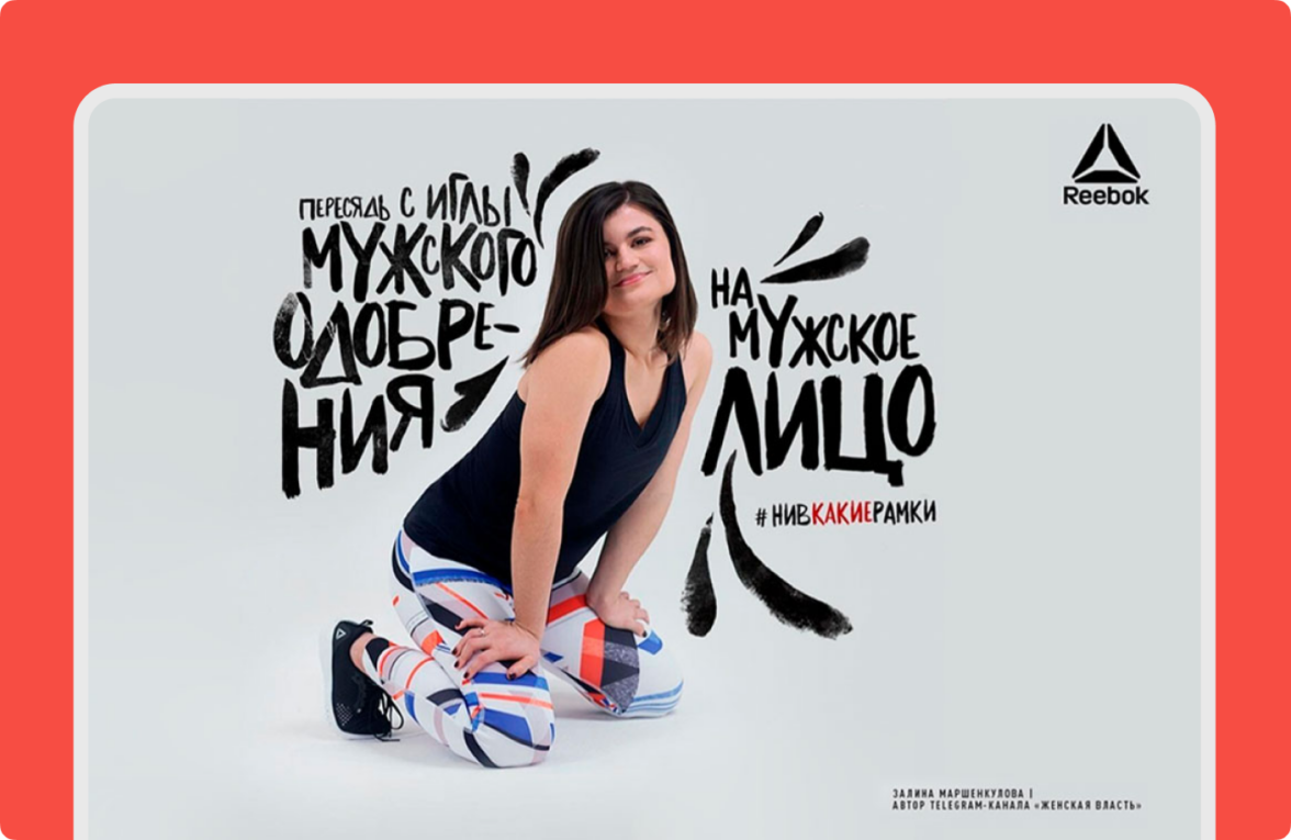 В 2019 году российское подразделение Reebok адаптировало западную кампанию #BeMoreHuman. Компания добавила в рекламу провокационный слоган о «мужском одобрении» и яркие цитаты от фем-активисток, следуя тренду роста феминисткой повестки и бодипозитива в маркетинге. Команда бренда рассчитывала, что слоган замотивирует женщин заниматься тем, что им нравится.