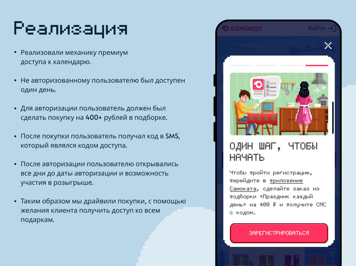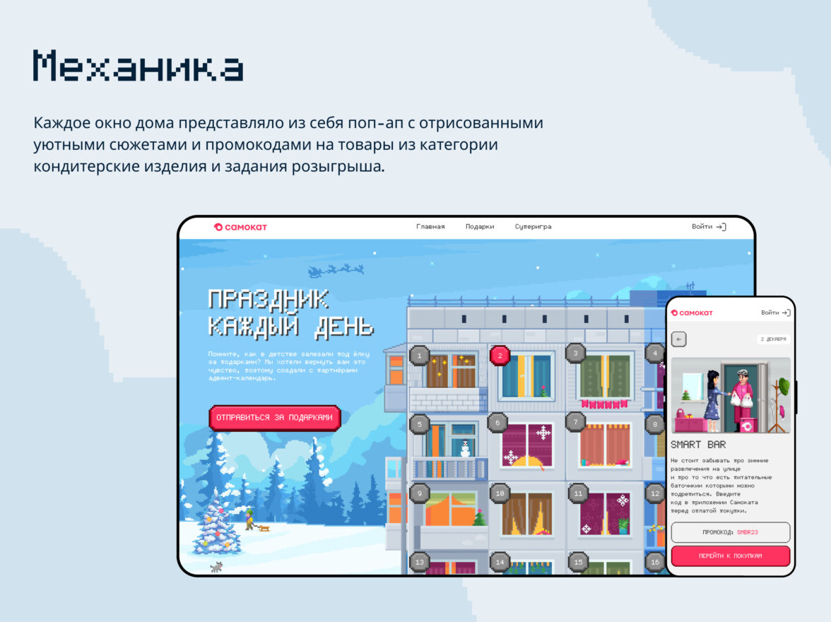 API-интеграция в игровых проектах может работать по двум сценариям, разберём их на примере Новогоднего адвент календаря, который мы делали для Самоката в прошлом году.