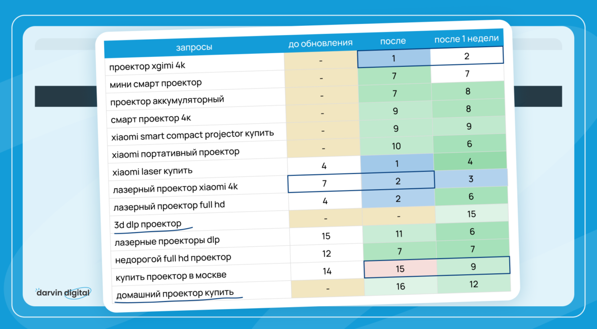 Интернет-магазин проекторов изначально ворвался в выдачу по высокочастотным фразам. Например, «проектор xgimi 4k» сразу занял 1-е место, а «лазерный проектор Xiaomi 4k» поднялся с 7-й позиции на 2-ю.