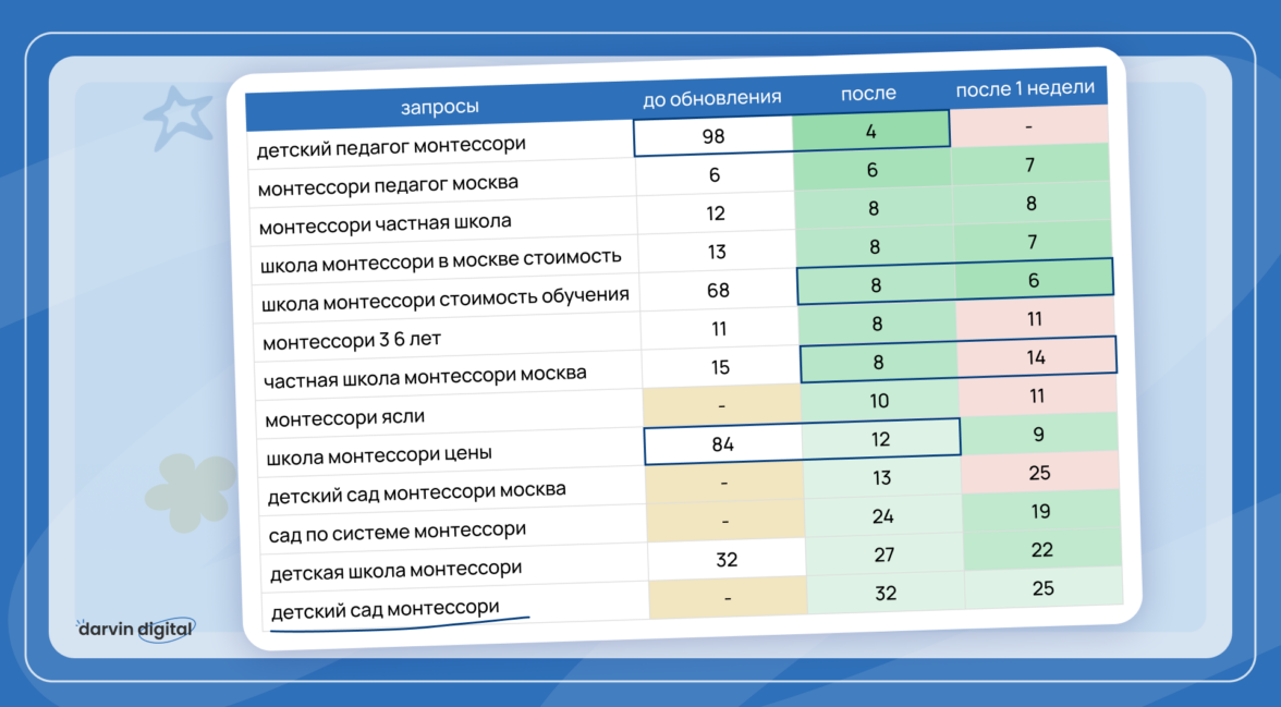 Новые запросы, например, «детский сад монтессори» поднялись до 25 с 32.