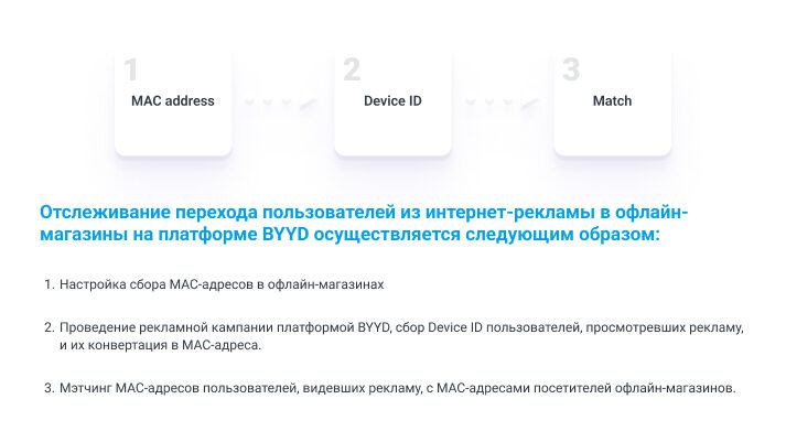 После проведения рекламной кампании собираются Device ID пользователей, которые её увидели. С помощью партнерских поставщиков данных, включая данные провайдеров, BYYD осуществляет конвертацию собранных Device ID в соответствующие MAC-адреса.