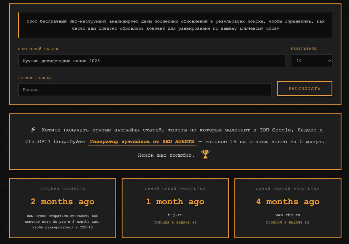 Наша команда столкнулась с тем, что вручную считать среднюю частоту обновлений в ТОП-выдаче — очень трудоемко, поэтому мы создали автоматического AI-агента: https://freshness.seo-agents.io