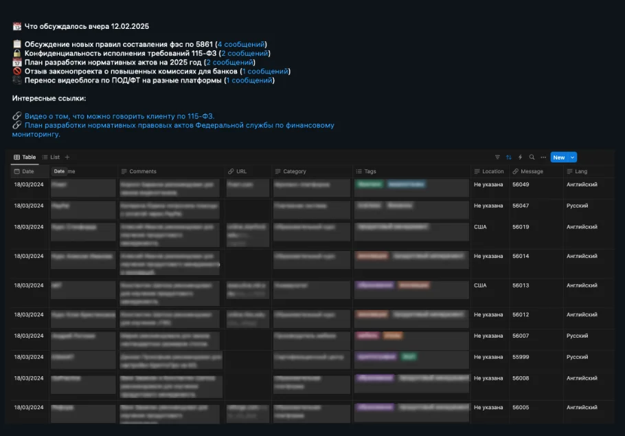 Создано более 1000 структурированных баз данных в Notion на основе сообщений участников.
