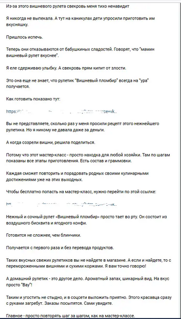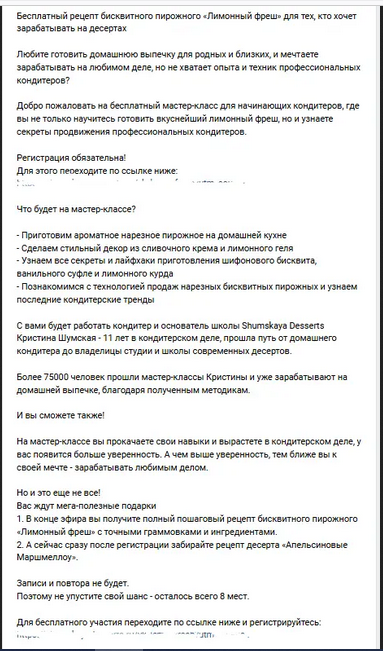 Трафик приходит на бесплатный мастер-класс по выпечке торта. Он идёт на сайт напрямую из ВКонтакте.