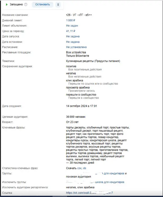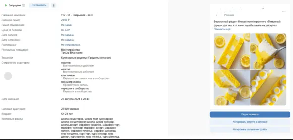 В июне этого года к нам обратилась онлайн-школа, которая учит печь домашние десерты. Ребята раньше прекрасно жили на базу, собранную в Инстаграме* (*Деятельность организации запрещена на территории РФ) и Яндексе. По известным причинам захотелось освоить ВКонтакте, когда самый жирный канал лидогенерации прикрыли.