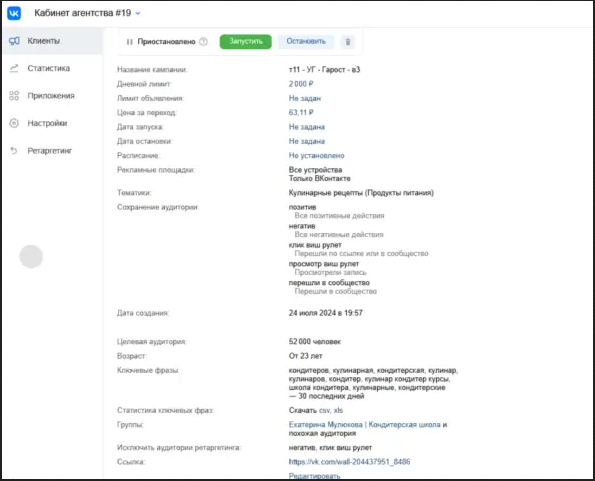 На скрине — настройки по этой рекламной кампании.