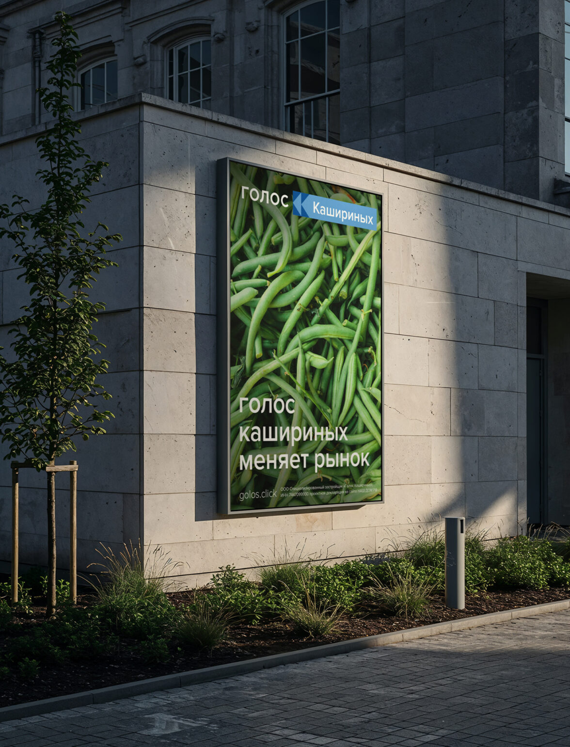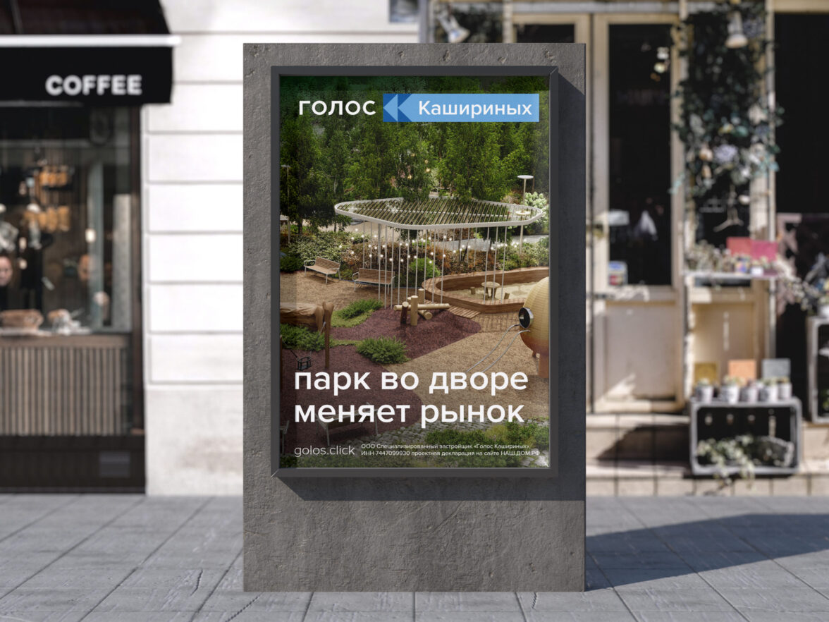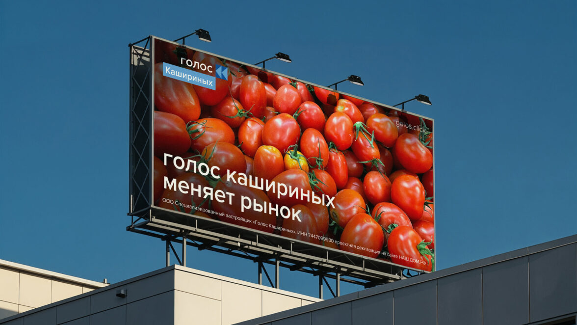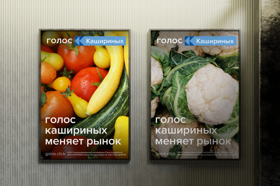По сути, дом находится на месте рынка. И мы придумали слоган «Голос Кашириных меняет рынок», в котором, во-первых, заложена мысль о том, что этот дом меняет каширинский рынок и меняет его на детский сад, на площадки, на классную территорию. Во-вторых, мысль, что сам по себе застройщик меняет рынок недвижимости к лучшему за счет того, что строит классные объекты.