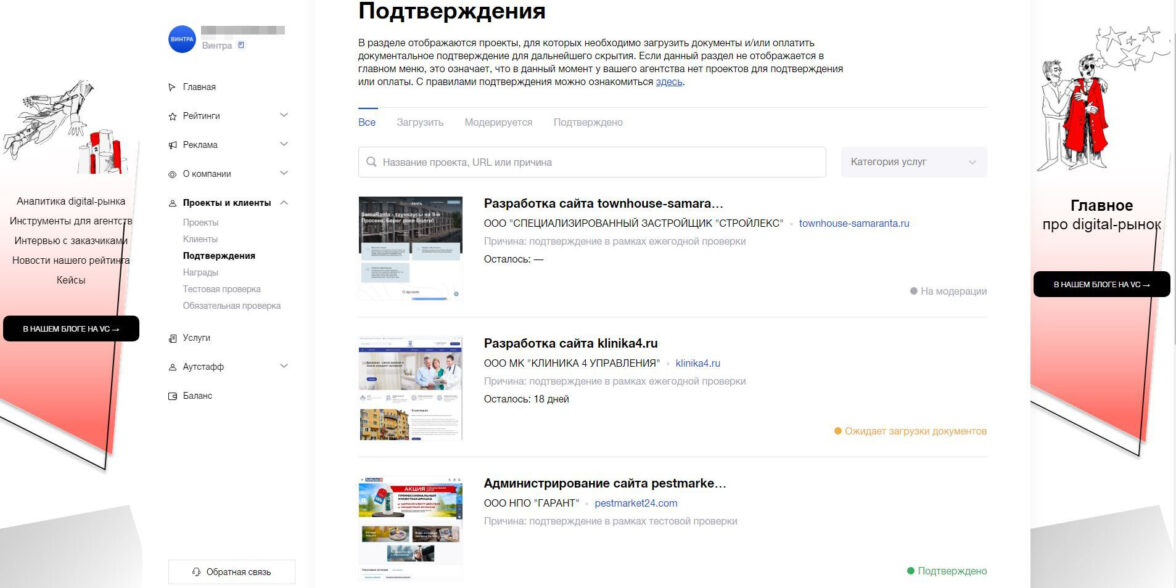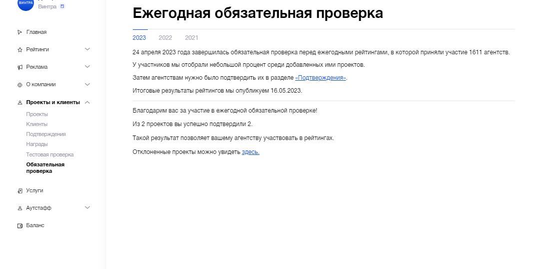 Проверка проходит просто. Система выбрала 4 проекта — примерно 5% от тех, что были внесены. От нас требовалось загрузить документы — обычно это Договор и Акт выполненных работ. У нас без проблем приняли также счета и платежные поручения. Как загружаются документы расскажем чуть подробнее, так как не нашли детальную информацию об этом от «Рейтинга Рунета».