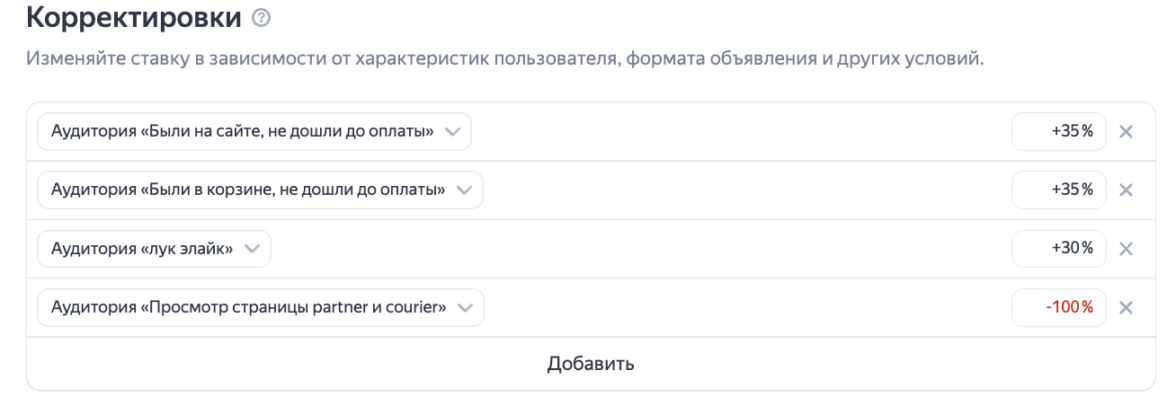 Настройки можно было сделать еще тоньше — например, показывать баннеры только тем, кто делал заказ более одного раза. Но тогда мы потеряли бы до 60% охвата. А в некоторые дни нам бы вообще не хватило базы, нижний порог в Яндекс Аудиториях — 100 контактов. Поэтому мы просто показывали баннеры людям, которые хотя бы один раз совершали покупки на сайте клиента.