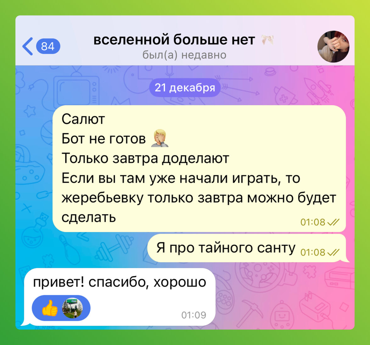 В итоге приходилось писать пользователям в личку, извиняться, объяснять, что запуск завтра. А когда запустили жеребьёвку, функция отправки результатов заработала только на следующий день. Первым участникам я вручную писал, кто для кого Санта.