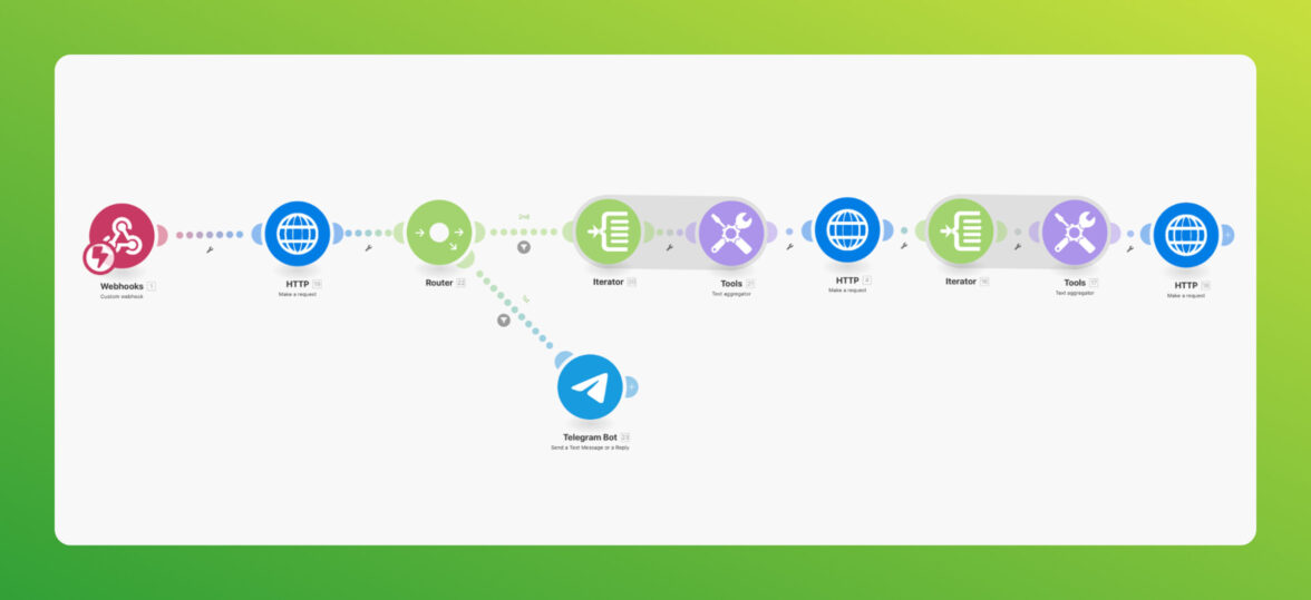 Первая проблема — жеребьёвка. Нужно было случайно перемешать участников так, чтобы никто не дарил сам себе и ни у кого не было дублей и каждый получил своего подопечного. В Make не оказалось встроенной функции перемешивания массива, поэтому пришлось городить конструкцию из итераторов, агрегаторов и HTTP-запросов.
