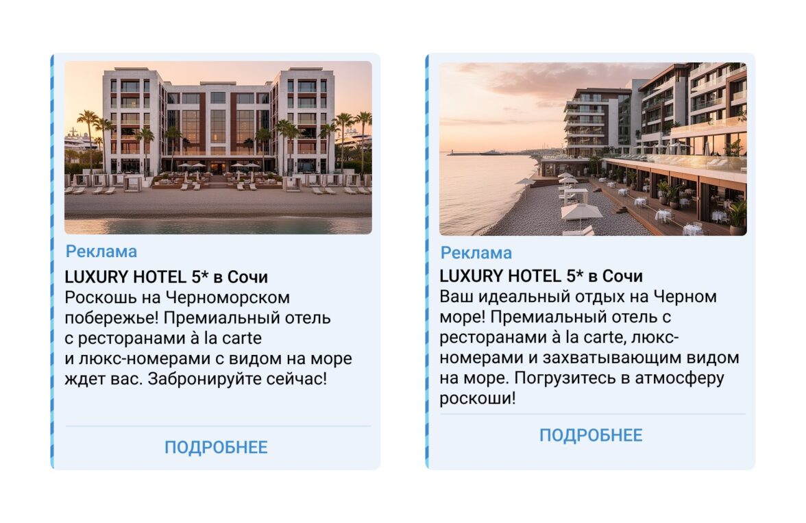 Мы выбрали рекламный формат “баннер+текст” с целью “Подписка на TG-канал рекламодателя”. На баннерах демонстрировали красивые интерьеры и экстерьеры отеля, а в тексте прописывали конкурентные преимущества.