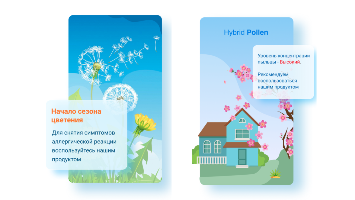 В рамках кампании был реализован персонализированный rich-media креатив, который динамически подстраивался под активный аллерген. Показ происходил, когда его концентрация в выбранном городе была выше 3-х баллов. Когда в один день было активно несколько аллергенов, то их показ на баннере равномерно распределялся между собой.