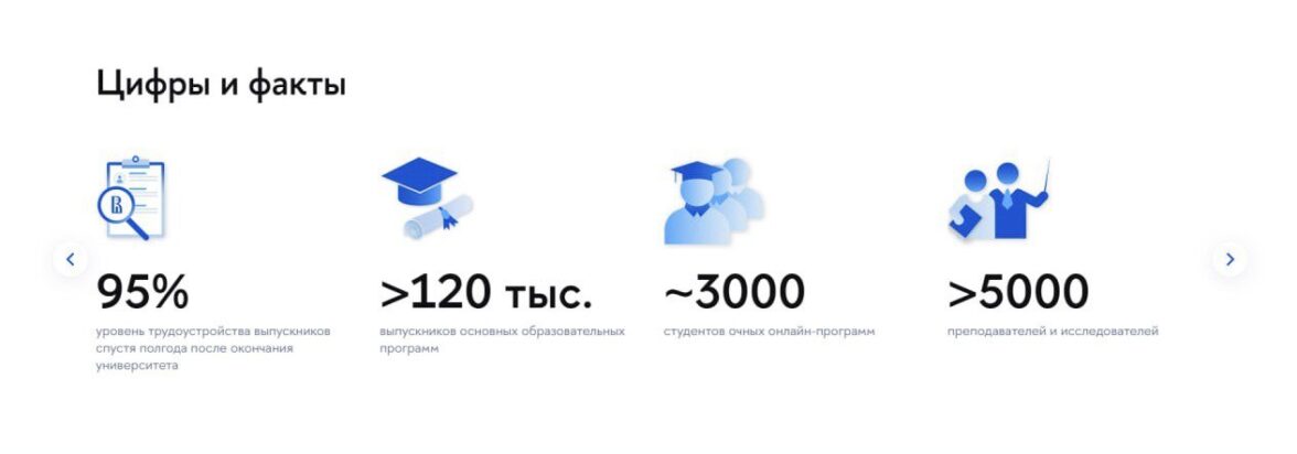 Подчеркните сильные стороны вашего образовательного проекта, а также квалификацию и опыт ваших преподавателей. Например, на сайте ВШЭ используются конкретные факты и статистика, что помогает привлечь внимание и усилить положительные впечатления.