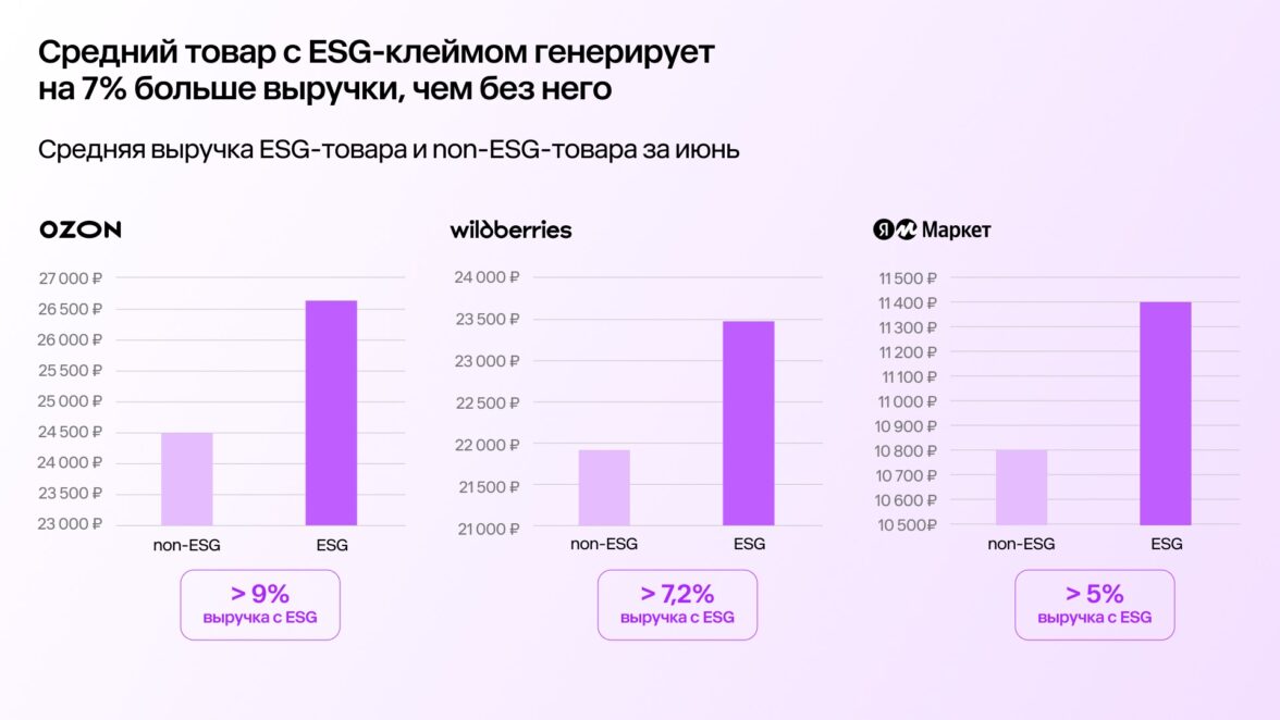 В среднем товар с ESG-маркером генерирует на 7% больше выручки, чем товар без него. При этом темпы роста таких товаров выше: за январь–июль 2025 года выручка от ESG росла на 1,2 п.п. быстрее, чем у non-ESG.