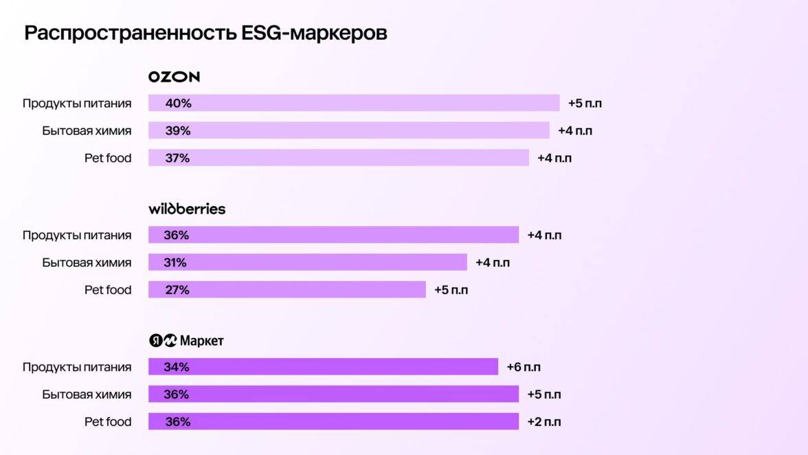 Если объединить данные трех площадок, то бытовая химия, еда для животных и продукты питания — наиболее насыщенные ESG-заявлениями категории (в среднем 36% товаров имеют такие клеймы).