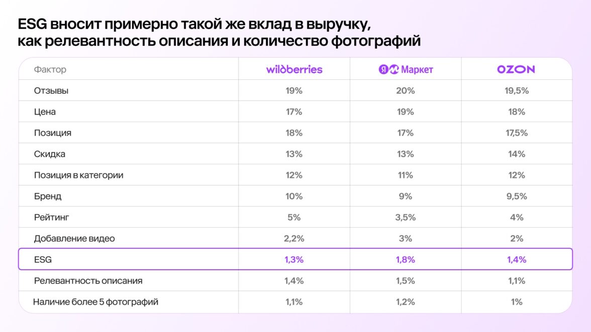 Авторы исследования впервые определили влияние ESG-заявлений на продажи и оценили вес этого вклада. На маркетплейсах ESG приносит примерно такой же прирост выручки, как релевантность описания и фотографий в карточке товара.